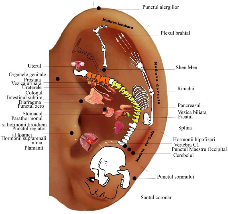 - Detecție – localizarea punctelor energetice pe ureche și/sau corp.